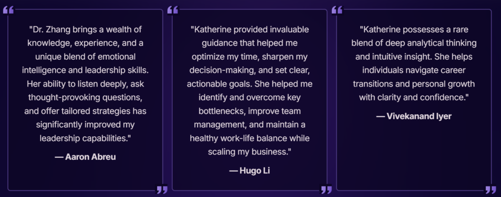 Dr. Katherine Zhang’s coaching approach is a powerful blend of strategic insight, systemized execution, and resilience-building. Rooted in her expertise as both a leadership coach, resilience coach and a business operating system (BOS) coach, she focuses on four key pillars that drive transformative growth: