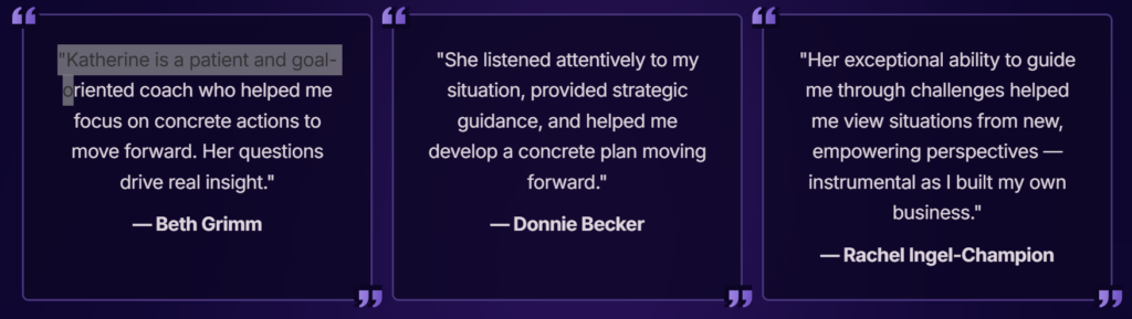 Katherine’s coaching has been transformative for many leaders and professionals. Here are some testimonials from her clients:
